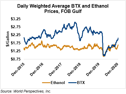 BTX component prices were higher last week and are extending those gains through Tuesday’s market close: Benzene is up 2.7 percent while Toluene is up 4.1 percent, and Xylene is up 4.6 percent. The estimated weighted average aromatic price is currently 54.35 cents/liter (205.76 cents/gallon), up from last Friday’s close. The BTX-Houston ethanol spread widened last week, and the weighted average BTX price is 11.05 cents/liter (41.83 cents/gallon) higher than the FOB Houston ethanol price.