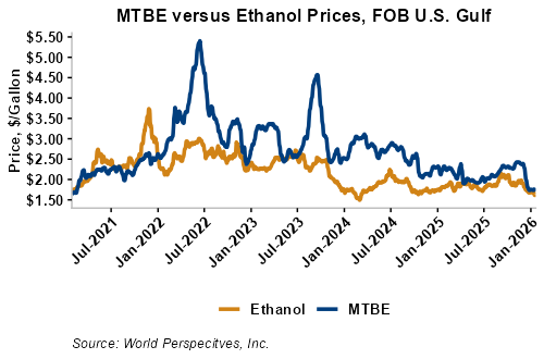MTBE prices fell 7.2 percent last week but strengthened in early week trading to gain 2 percent from Friday’s close through Tuesday’s trading. MTBE’s premium to FOB Houston ethanol has increased from last week’s report and stands at 3.85 cents/liter (14.58 cents/gallon).