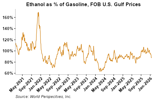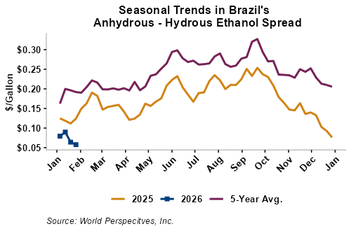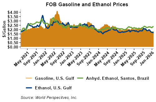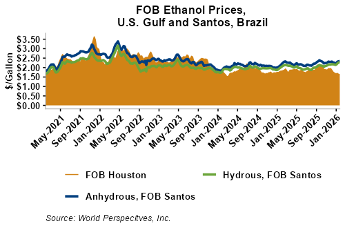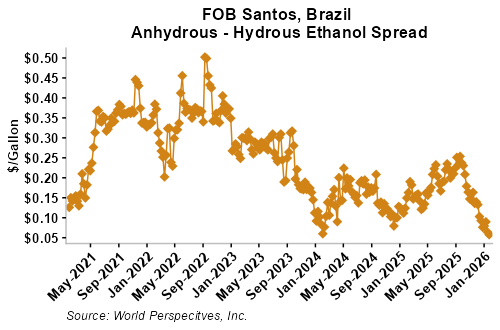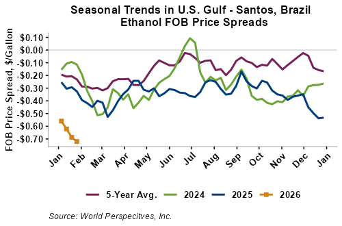 The FOB Gulf-Santos, Brazil ethanol spread has widened from last week’s close through Tuesday’s trading and is currently at -19.02 cents/liter (-71.98 cents/gallon).