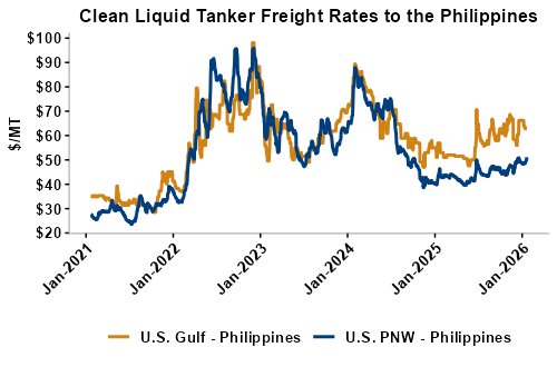 Liquid tanker rates are 3 percent higher on average this week with offers for Brazil to Europe seeing the largest gains (up 14 percent). Freight from the U.S. Gulf to South Brazil saw the largest declines and is down 3 percent from last week. On average, tanker freight from the U.S. Gulf is up 1 percent this week while freight from the PNW has posted a 6 percent increase. Liquid tanker freight rates from Brazil are up 7 percent, on average, this week. Freight rates across all origins are 12 percent higher than this same week in 2025.