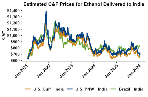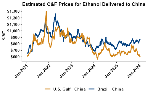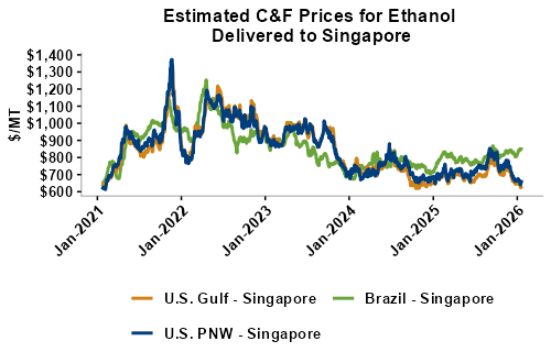 On a cost-and-freight (C&F) basis, offers are mostly mixed this week as changes in freight rates and FOB ethanol offers have largely offset one another. Prices for ethanol C&F to Central America from the U.S. Gulf are down 0.3 percent this week and are down 7.8 percent from this same week in 2025. Values for PNW ethanol to Southeast Asia average $661.96/MT this week, up 3.6 percent from the prior week but down 2.8 percent year-over-year. That compares to U.S. Gulf to Southeast Asia C&F prices that average $618.96/MT and are down 0.2 percent from last week and are down 6.8 percent year-over-year. C&F prices for Brazilian ethanol to Southeast Asia are up 1.8 percent from last week.