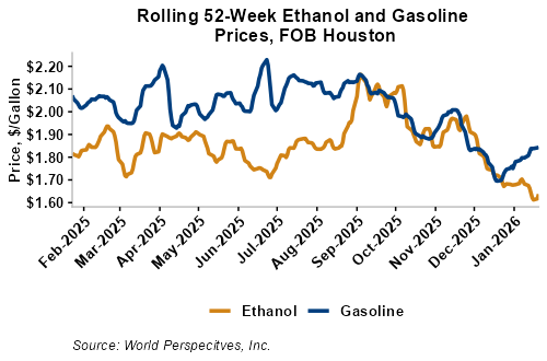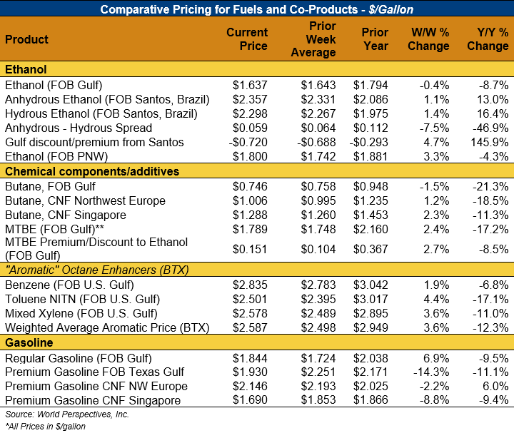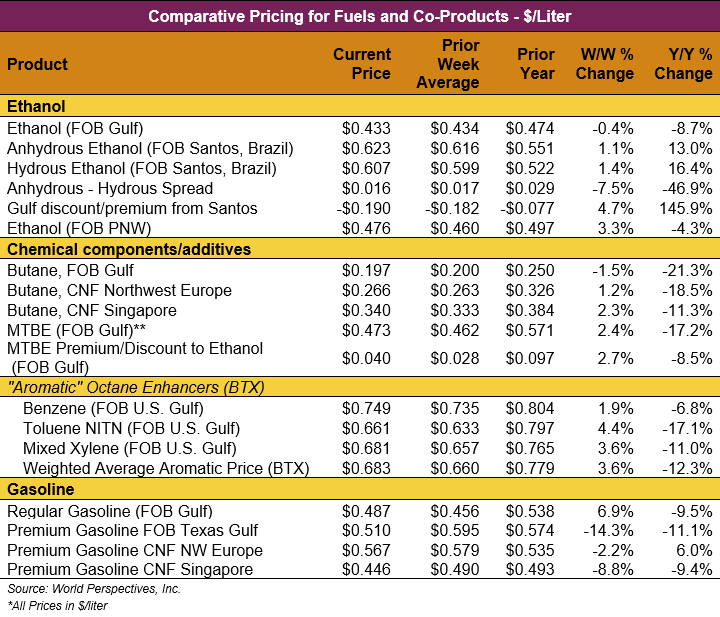 FOB Houston ethanol prices finished last week 6.3 percent lower but are up 1.5 percent through Tuesday’s trading from Friday’s close. FOB Houston ethanol prices are quoted at 43.25 cents/liter (163.72 cents/gallon). FOB Santos, Brazil anhydrous ethanol prices were higher last week; they are up in early week trading, rising 1.1 percent to 62.27 cents/liter (235.7 cents/gallon) through Tuesday’s close.