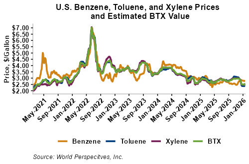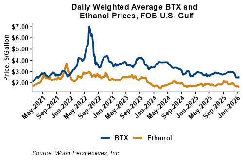 BTX component prices were sharply lower last week but traded higher through Tuesday’s market close: Benzene was up 1.6 percent while Toluene was up 3.7 percent, and Xylene was up 3 percent. The estimated weighted average aromatic price is currently 67.98 cents/liter (257.35 cents/gallon), up from last Friday’s close. The BTX-Houston ethanol spread widened last week, and the weighted average BTX price is 24.73 cents/liter (93.62 cents/gallon) higher than the FOB Houston ethanol price.