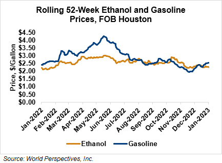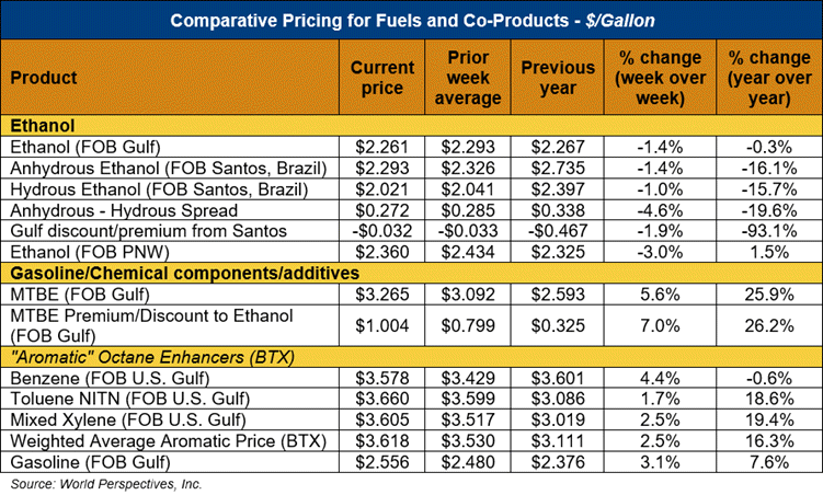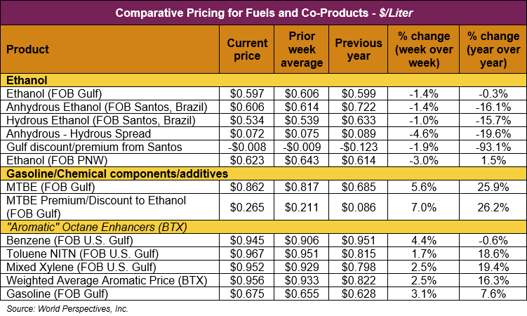 FOB Houston ethanol prices finished last week 0.4 percent higher but are down 0.5 percent through Tuesday’s trading from Friday’s close. FOB Houston ethanol prices are quoted at 59.73 cents/liter (226.09 cents/gallon). FOB Santos, Brazil anhydrous ethanol prices were lower last week; they are down in early week trading, falling 1.4 percent to 60.58 cents/liter (229.305 cents/gallon) through Tuesday’s trading.