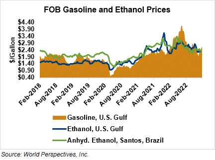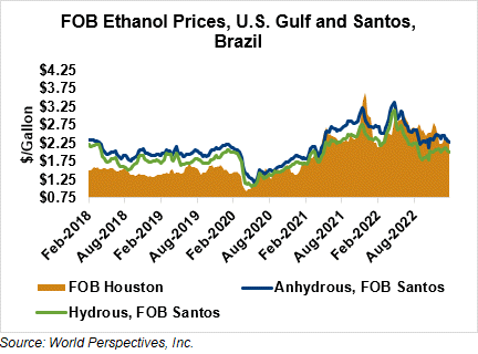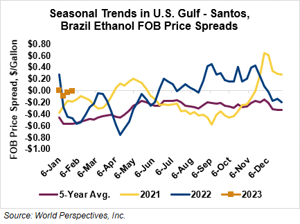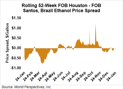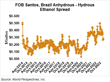 The FOB Gulf-Santos, Brazil ethanol spread has narrowed from last week’s close through Tuesday’s trading and is currently at -0.85 cents/liter (-3.21 cents/gallon).