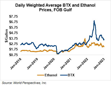 BTX component prices were sharply higher last week and were higher still through Tuesday’s market close: Benzene was up 3.8 percent while Toluene was up 1.5 percent, and Xylene was up 2.1 percent. The estimated weighted average aromatic price is currently 95.22 cents/liter (360.44 cents/gallon), up from last Friday’s close. The BTX-Houston ethanol spread widened last week, and the weighted average BTX price is 35.49 cents/liter (134.35 cents/gallon) higher than the FOB Houston ethanol price.