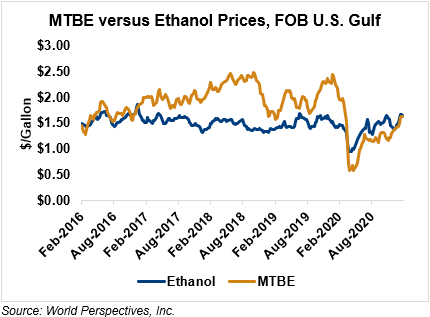 MTBE prices rose 1.4 percent last week and are extending those gains in early week trading, up 0.4 percent from Friday’s close through Tuesday’s trading. MTBE’s premium to FOB Houston ethanol has increased from last week’s report and stands at -0.3 cents/liter (-1.14 cents/gallon).