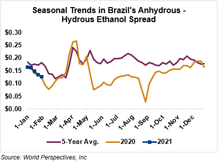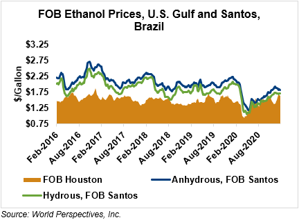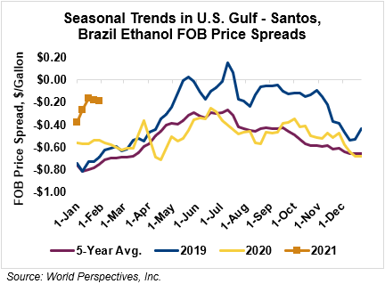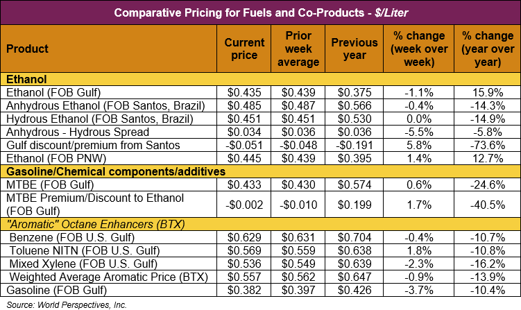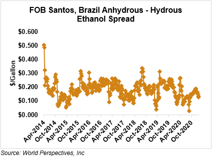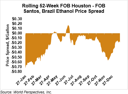 The FOB Gulf-Santos, Brazil ethanol spread has widened from last week’s close through Tuesday’s trading and is currently at -5.05 cents/liter (-19.12 cents/gallon).
