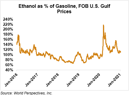 Market Outlook: U.S. ethanol prices ended last week 4.4 percent lower but are reversing that trend in early week trading, up 1.6 percent through Tuesday’s close. Midwest wholesale rack ethanol prices were lower to end last week and are down 1.2 percent through Tuesday’s market close to their last quote of 42.83 cents/liter (162.14 cents/gallon).
