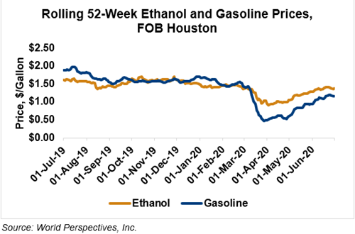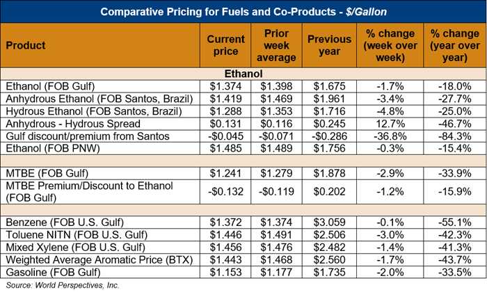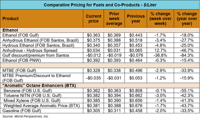 FOB Houston ethanol prices finished last week 0.8 percent higher but are down 1.7 percent through Tuesday’s trading from Friday’s close. FOB Houston ethanol prices are quoted at 36.29 cents/liter (137.36 cents/gallon). FOB Santos, Brazil anhydrous ethanol prices were lower last week; they are down in early week trading, falling 3.4 percent to 37.47 cents/liter (141.85 cents/gallon) through Tuesday’s trading.