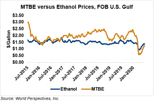 MTBE prices rose 12.2 percent last week but have reversed some of those gains in early week trading, down 2 percent from Friday’s close through Tuesday’s trading. MTBE’s premium to FOB Houston ethanol has increased from last week’s report and stands at -3.19 cents/liter (-12.08 cents/gallon).