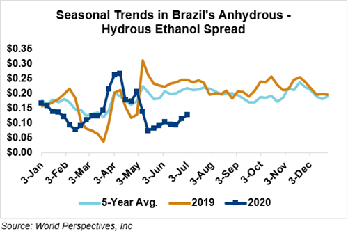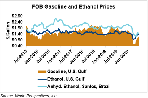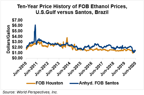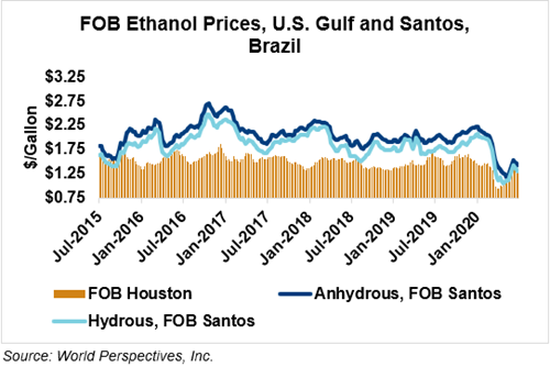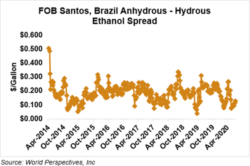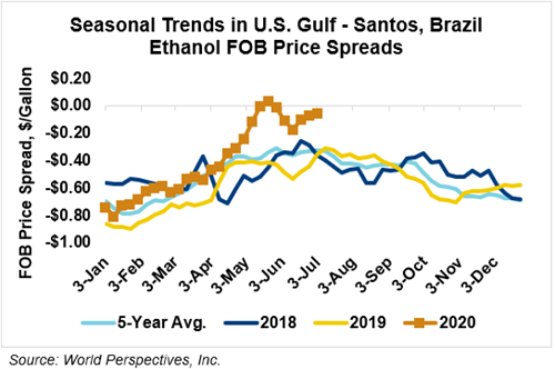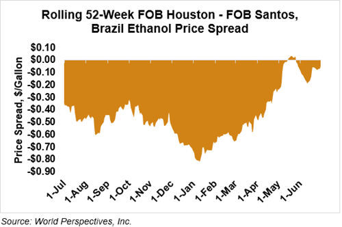 The FOB Gulf-Santos, Brazil ethanol spread has narrowed from last week’s close through Tuesday’s trading and is currently at -1.19 cents/liter (-4.49 cents/gallon).
