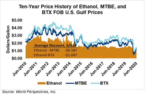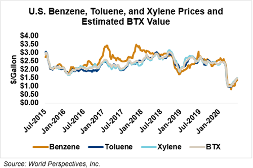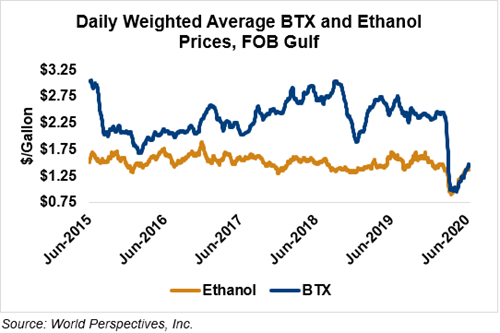 BTX component prices were sharply higher last week and are mixed through Tuesday’s market close: Benzene is up 0 percent while Toluene is down 2.2 percent, and Xylene is down 0.6 percent. The estimated weighted average aromatic price is currently 38.38 cents/liter (145.3 cents/gallon), down from last Friday’s close. The BTX-Houston ethanol spread widened last week, and the weighted average BTX price is 2.1 cents/liter (7.94 cents/gallon) higher than the FOB Houston ethanol price.