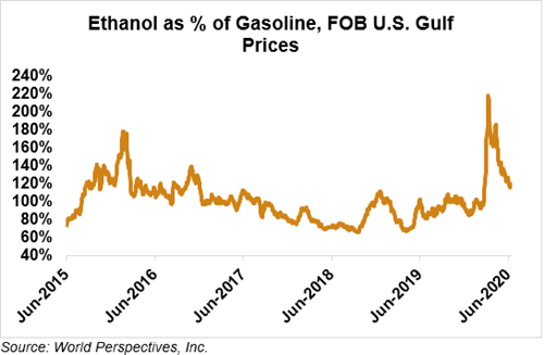 Market Outlook: U.S. ethanol prices ended last week 7.6 percent lower but are reversing that trend in early week trading, up 3.1 percent through Tuesday’s close. Midwest wholesale rack ethanol prices were lower to end last week and are down 0.3 percent through Tuesday’s market close to their last quote of 37.75 cents/liter (142.91 cents/gallon).