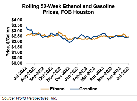 FOB Houston ethanol prices finished last week 4 percent lower but are up 2.2 percent through Tuesday’s trading from Friday’s close. FOB Houston ethanol prices are quoted at 65.36 cents/liter (247.41 cents/gallon). FOB Santos, Brazil anhydrous ethanol prices were lower last week; they are down in early week trading, falling 5.4 percent to 58.2 cents/liter (220.3 cents/gallon) through Tuesday’s trading.