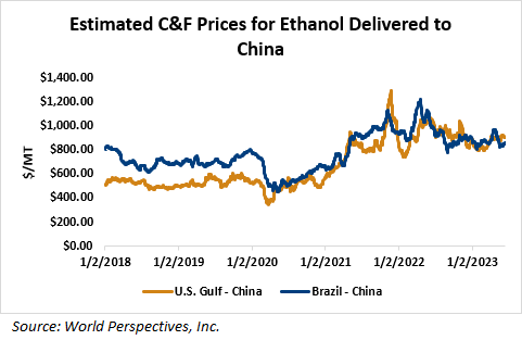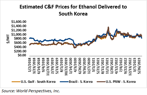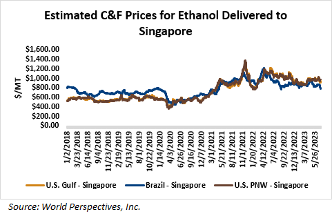 On a cost-and-freight (C&F) basis, offers from the U.S. Gulf are higher due to firmer FOB prices while lower offers for PNW and Brazilian ethanol and less costly freight from these origins pressured offers. Prices for ethanol C&F to Central America from the U.S. Gulf are up 0.7 percent this week and are down 5.7 percent from this same week in 2022. Values for PNW ethanol to Southeast Asia average $805.32/MT this week, down 4.8 percent from the prior week and down 18.5 percent year-over-year. That compares to U.S. Gulf to Southeast Asia C&F prices that average $915.67/MT and are up 1.3 percent from last week but are down 9.6 percent year-over-year. C&F prices for Brazilian ethanol to Southeast Asia are down 2.8 percent from last week.