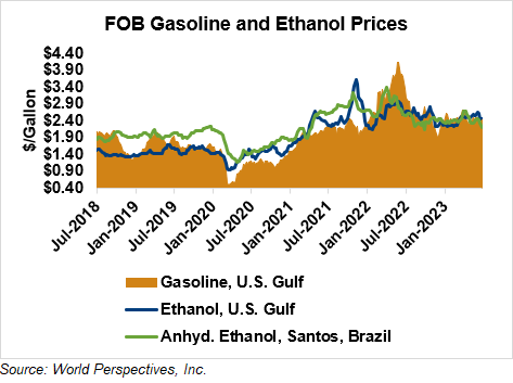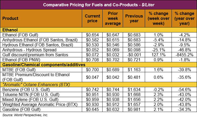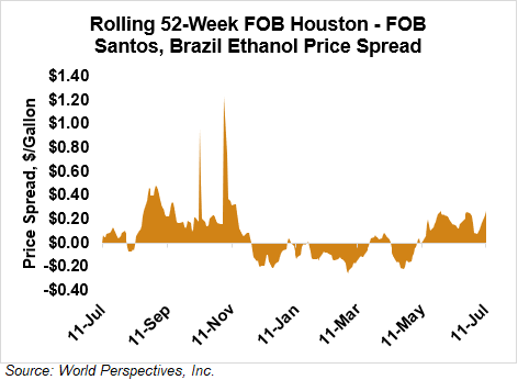 The FOB Gulf-Santos, Brazil ethanol spread has widened from last week’s close through Tuesday’s trading and is currently at 7.16 cents/liter (27.11 cents/gallon).