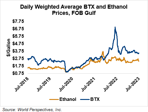 BTX component prices were mixed last week and continued that trend through Tuesday’s market close: Benzene was down 0.2 percent while Toluene was up 2 percent, and Xylene was up 1.9 percent. The estimated weighted average aromatic price is currently 92.77 cents/liter (351.19 cents/gallon), up from last Friday’s close. The BTX-Houston ethanol spread widened last week, and the weighted average BTX price is 27.41 cents/liter (103.77 cents/gallon) higher than the FOB Houston ethanol price.