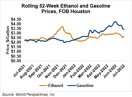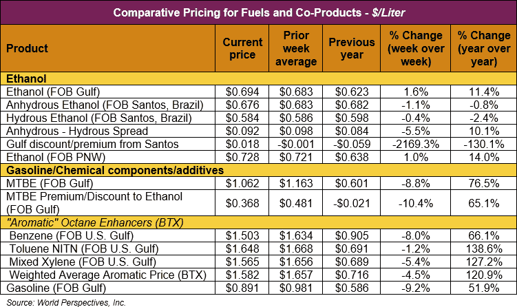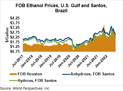 FOB Houston ethanol prices finished last week 6.7 percent lower but are up 3.3 percent through Tuesday’s trading from Friday’s close. FOB Houston ethanol prices are quoted at 69.37 cents/liter (262.6 cents/gallon). FOB Santos, Brazil anhydrous ethanol prices were lower last week; they are down in early week trading, falling 1.1 percent to 67.6 cents/liter (255.885 cents/gallon) through Tuesday’s trading.