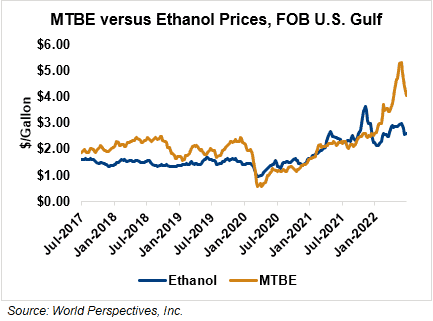 MTBE prices fell 6 percent last week and extended those losses in early week trading, falling 7.7 percent from Friday’s close through Tuesday’s trading. MTBE’s premium to FOB Houston ethanol has decreased from last week’s report and stands at 38.05 cents/liter (144.02 cents/gallon).