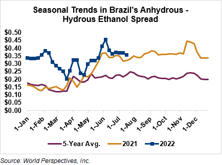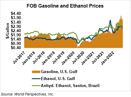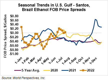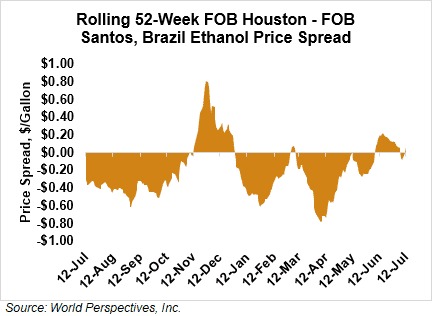 The FOB Gulf-Santos, Brazil ethanol spread has widened from last week’s close through Tuesday’s trading and is currently at 1.77 cents/liter (6.71 cents/gallon).