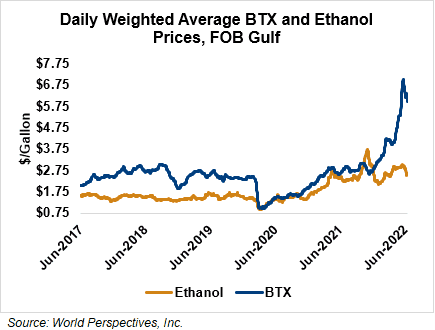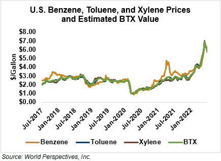 BTX component prices were mixed last week but were lower through Tuesday’s market close: Benzene was down 7.3 percent while Toluene was down 1 percent, and Xylene was down 4.6 percent. The estimated weighted average aromatic price is currently 159.2 cents/liter (602.63 cents/gallon), down from last Friday’s close. The BTX-Houston ethanol spread narrowed last week, and the weighted average BTX price is 89.83 cents/liter (340.03 cents/gallon) higher than the FOB Houston ethanol price.