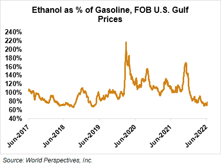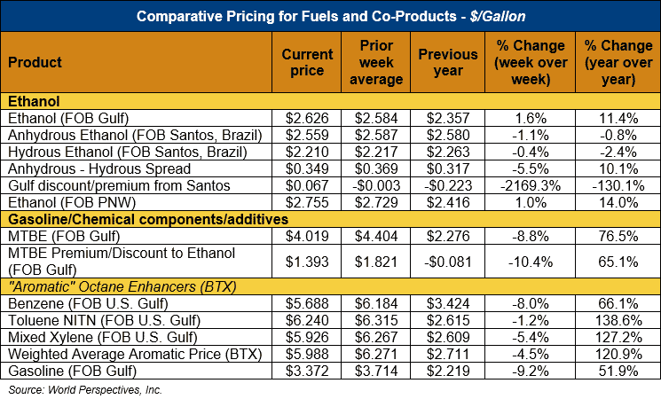 Market Outlook: U.S. ethanol prices ended last week 0.8 percent lower and weakened further in early week trading to fall 2 percent through Tuesday’s close. Midwest wholesale rack ethanol prices were lower to end last week but were up 1.8 percent through Tuesday’s market close to their last quote of 74.57 cents/liter (282.26 cents/gallon).
