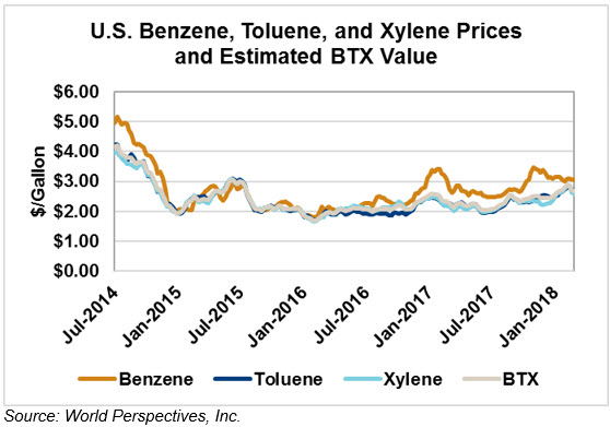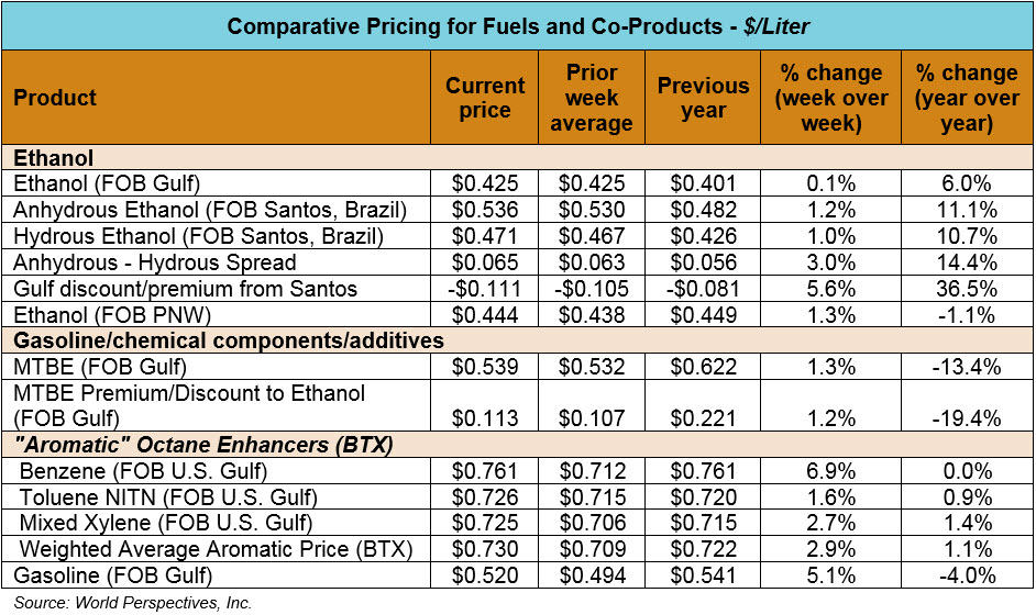 BTX component prices were higher to end last week but have continued that trend through Tuesday’s trading: Benzene is up 5.7 percent; Toluene is up 1.5 percent and Xylene is up 2.3 percent. The estimated weighted average aromatic price is currently 72.65 cents/liter (275.01 cents/gallon), up 2.5 percent from last Friday’s close. The BTX-Houston ethanol spread widened from last week, and the weighted average BTX price remains 30.13 cents/liter (114.06 cents/gallon) higher than the FOB Houston ethanol price.