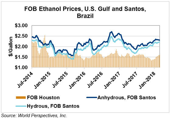 FOB Houston ethanol prices finished last week 0.4 percent lower; prices are up 0.1 percent through Tuesday’s trading from Friday’s close. FOB Houston ethanol prices are quoted at 42.519 cents/liter (160.95 cents/gallon). FOB Santos, Brazil ethanol prices ended last week up 1.5 percent; they are up slightly from Friday’s close at 53.57 cents/liter (202.795 cents/gallon) through Tuesday’s trading.