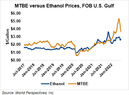 MTBE prices fell 10.6 percent last week and extended those losses in early week trading, falling 7.9 percent from Friday’s close through Tuesday’s trading. MTBE’s premium to FOB Houston ethanol has decreased from last week’s report and stands at 24.78 cents/liter (93.81 cents/gallon).