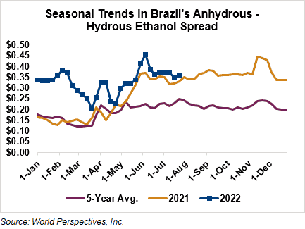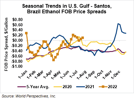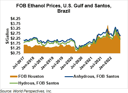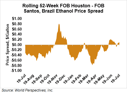 The FOB Gulf-Santos, Brazil ethanol spread has widened from last week’s close through Tuesday’s trading and is currently at 3 cents/liter (11.37 cents/gallon).