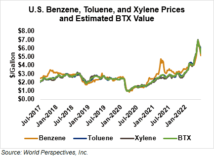 BTX component prices were sharply lower last week and continued that trend through Tuesday’s market close: Benzene was down 6.2 percent while Toluene was down 9.6 percent, and Xylene was down 6.6 percent. The estimated weighted average aromatic price is currently 143.63 cents/liter (543.7 cents/gallon), down from last Friday’s close. The BTX-Houston ethanol spread narrowed last week, and the weighted average BTX price is 72.66 cents/liter (275.03 cents/gallon) higher than the FOB Houston ethanol price.