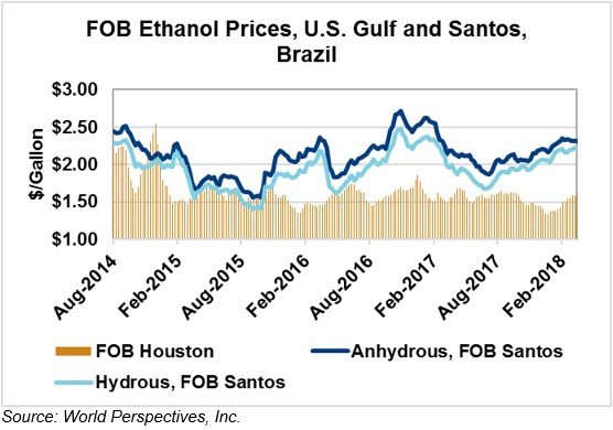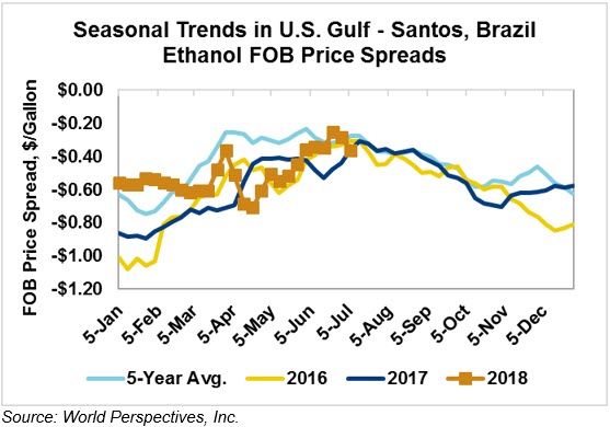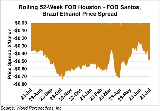The FOB Gulf-Santos, Brazil spread widened from last week’s close through Tuesday’s trading and is currently at -12.64 cents/liter (-47.85 cents/gallon).