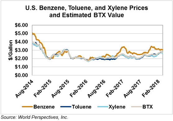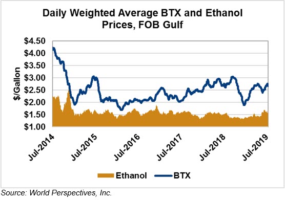BTX component prices were higher to end last week but have reversed that trend through Tuesday’s trading: Benzene is down 3.5 5.7 percent; Toluene is down 2.4 percent and Xylene is down 1.7 percent. The estimated weighted average aromatic price is currently 70.93 cents/liter (268.51 cents/gallon), down 2.1 percent from last Friday’s close. The BTX-Houston ethanol spread narrowed from last week, and the weighted average BTX price remains 27.472 cents/liter (111.56 cents/gallon) higher than the FOB Houston ethanol price.