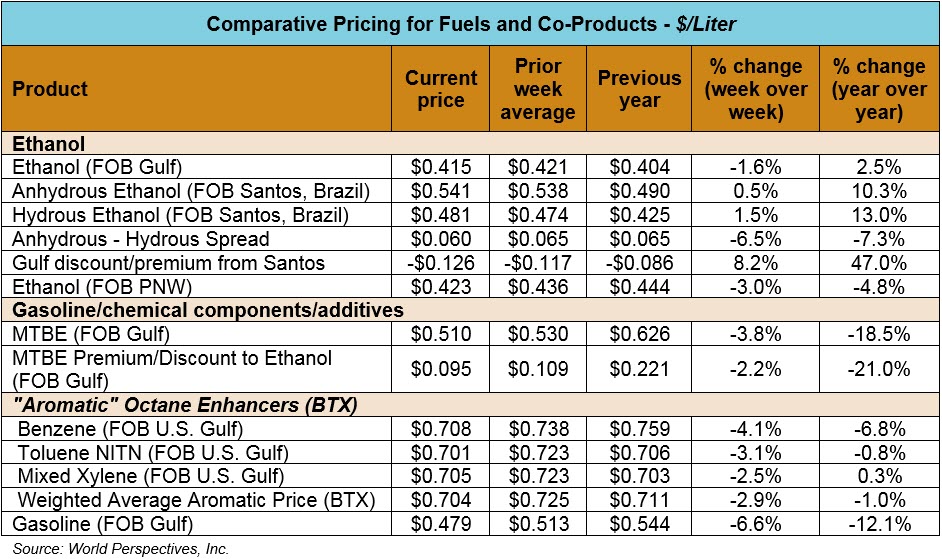 Market Outlook: U.S. ethanol prices ended last week down 5.5 percent but are up 1.9 percent in early week trading. Midwest wholesale rack ethanol prices were down 3 percent to end last week and have moved 0.6 percent lower through Tuesday’s market close and were last quoted at 43.81 cents/liter (165.85 cents/gallon).