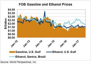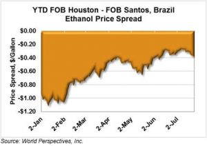 Ethanol prices in Brazil are higher after reaching one-year lows earlier this month. Reported prices for Ethanol FOB Brazil cargo were quoted at $1.99/gallon ($0.523/liter). Rising Brazilian ethanol and falling U.S. prices increased the price spread for ethanol FOB ports this week. The spread between ethanol FOB Houston and FOB Santos, Brazil widened to -$0.40/gallon (-$0.103/liter) this week.