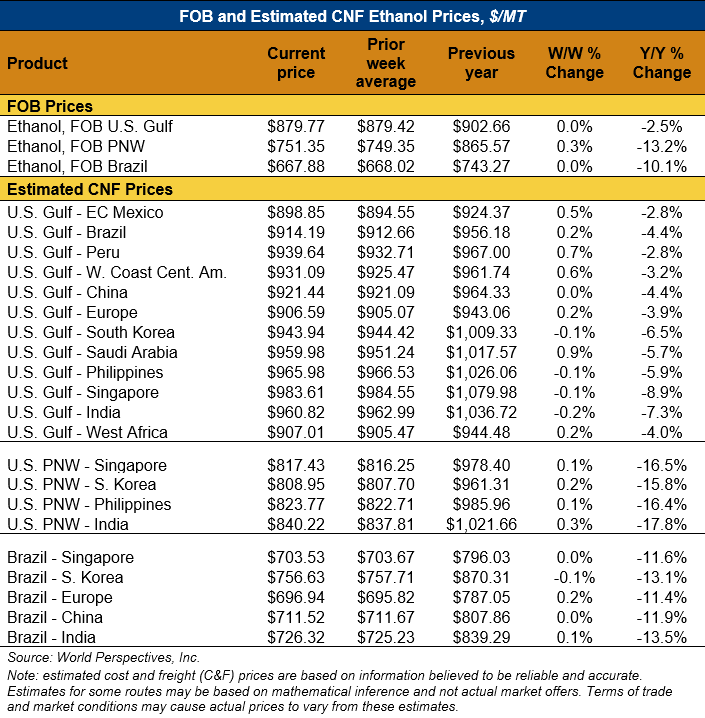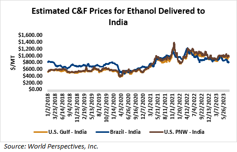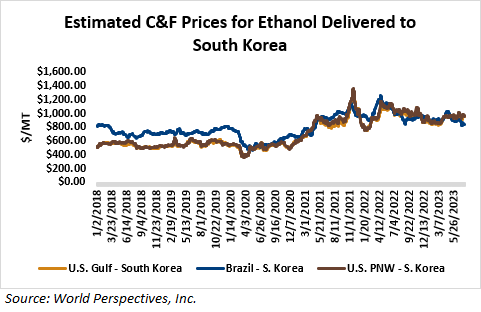 On a cost-and-freight (C&F) basis, offers are mostly higher this week as both freight rates and FOB ethanol offers have climbed higher. Prices for ethanol C&F to Central America from the U.S. Gulf are up 0.6 percent this week and are down 2.9 percent from this same week in 2022. Values for PNW ethanol to Southeast Asia average $816.72/MT this week, up 0.1 percent from the prior week but down 16.3 percent year-over-year. That compares to U.S. Gulf to Southeast Asia C&F prices that average $964.51/MT and are down 0.1 percent from last week and are down 7.1 percent year-over-year. C&F prices for Brazilian ethanol to Southeast Asia are down 0 percent from last week.