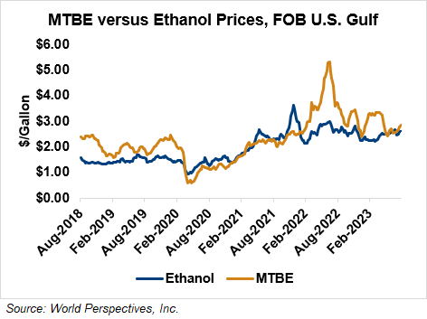 MTBE prices rose 3.6 percent last week and extended that rally in early week trading to gain 3.5 percent from Friday’s close through Tuesday’s trading. MTBE’s premium to FOB Houston ethanol has increased from last week’s report and stands at 6.96 cents/liter (26.35 cents/gallon).