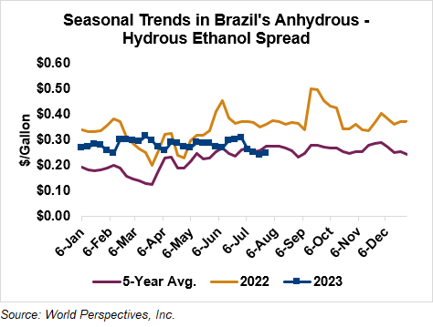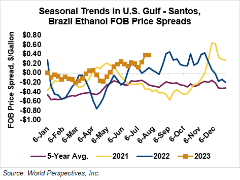 The FOB Gulf-Santos, Brazil ethanol spread has narrowed from last week’s close through Tuesday’s trading and is currently at 10.04 cents/liter (38.01 cents/gallon).