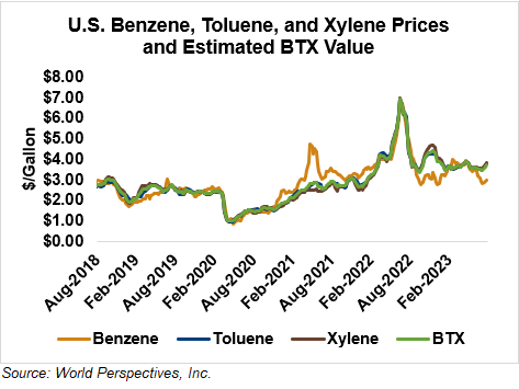 BTX component prices were higher last week and continued that trend through Tuesday’s market close: Benzene was up 1 percent while Toluene was up 2.1 percent, and Xylene was up 2.1 percent. The estimated weighted average aromatic price is currently 98.26 cents/liter (371.94 cents/gallon), up from last Friday’s close. The BTX-Houston ethanol spread widened last week, and the weighted average BTX price is 29.46 cents/liter (111.53 cents/gallon) higher than the FOB Houston ethanol price.