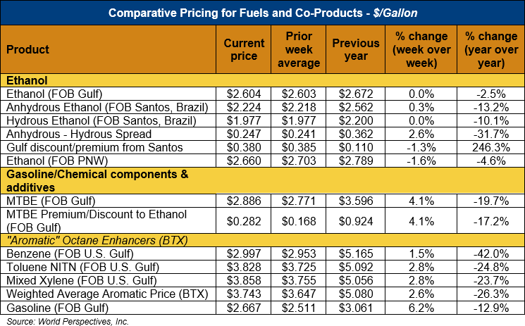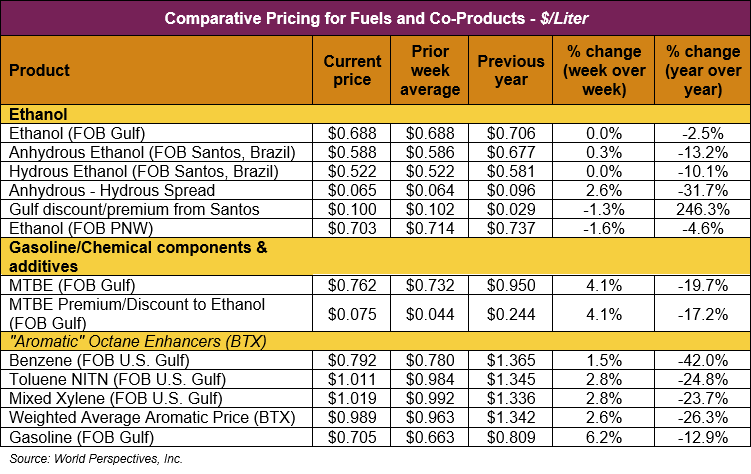 FOB Houston ethanol prices finished last week 3.3 percent higher but are down 0.3 percent through Tuesday’s trading from Friday’s close. FOB Houston ethanol prices are quoted at 68.79 cents/liter (260.41 cents/gallon). FOB Santos, Brazil anhydrous ethanol prices were lower last week; they are up in early week trading, rising 0.3 percent to 58.75 cents/liter (222.4 cents/gallon) through Tuesday’s trading.