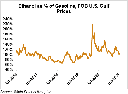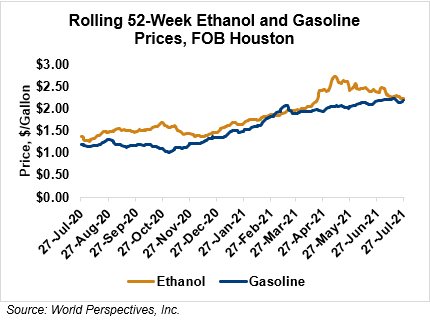 FOB Houston ethanol prices finished last week 0.5 percent higher but are down 2 percent through Tuesday’s trading from Friday’s close. FOB Houston ethanol prices are quoted at 58.88 cents/liter (222.87 cents/gallon). FOB Santos, Brazil anhydrous ethanol prices were higher last week; they are up in early week trading, rising 0.6 percent to 69.51 cents/liter (263.14 cents/gallon) through Tuesday’s trading.