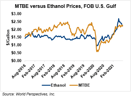 MTBE prices fell 4 percent last week but are paring some of those losses in early week trading, up 2.3 percent from Friday’s close through Tuesday’s trading. MTBE’s premium to FOB Houston ethanol has increased from last week’s report and stands at 0.77 cents/liter (2.93 cents/gallon).
