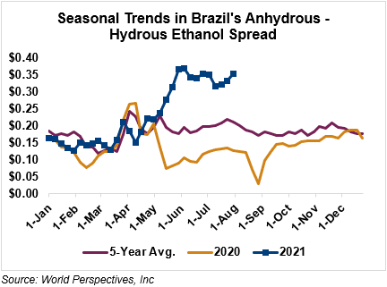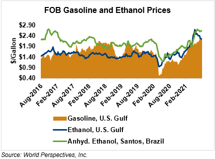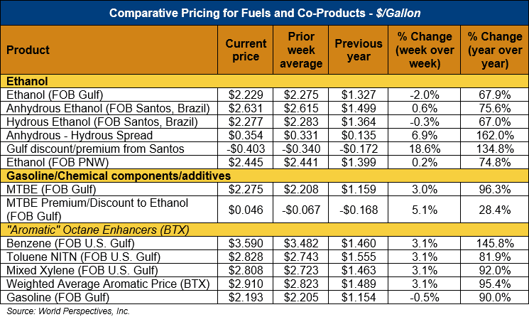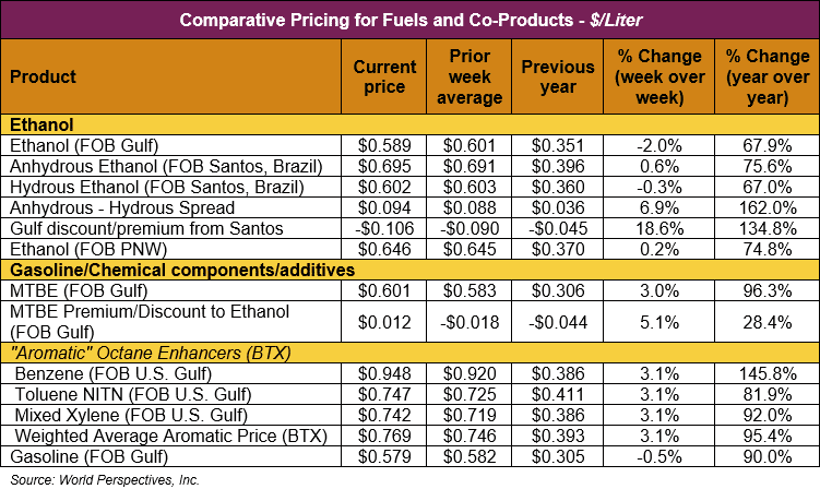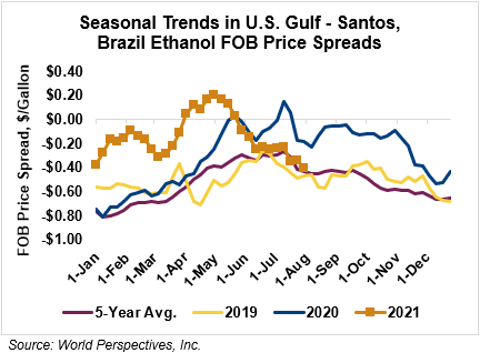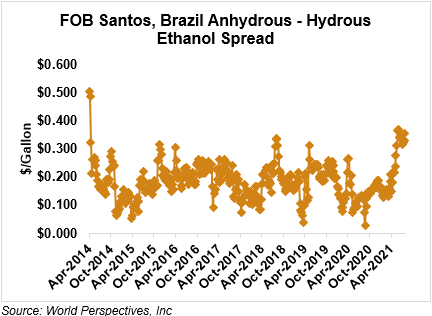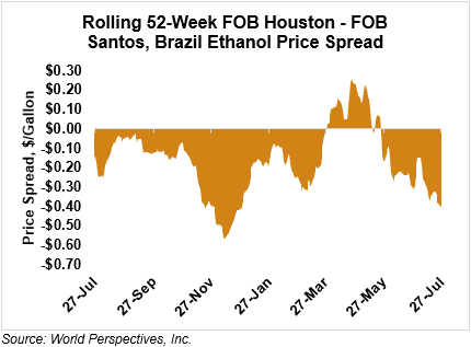 The FOB Gulf-Santos, Brazil ethanol spread has widened from last week’s close through Tuesday’s trading and is currently at -10.64 cents/liter (-40.27 cents/gallon).