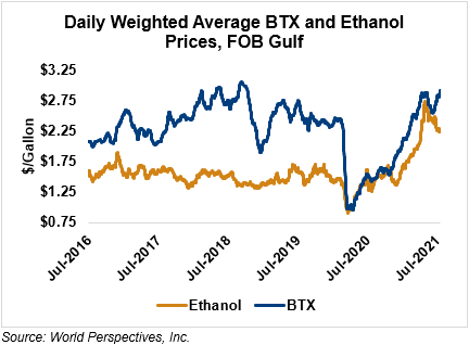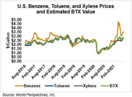 BTX component prices were higher last week and are adding to those gains through Tuesday’s market close: Benzene is up 2.5 percent while Toluene is up 2.6 percent, and Xylene is up 2.6 percent. The estimated weighted average aromatic price is currently 76.5 cents/liter (289.59 cents/gallon), up from last Friday’s close. The BTX-Houston ethanol spread widened last week, and the weighted average BTX price is 17.63 cents/liter (66.72 cents/gallon) higher than the FOB Houston ethanol price.