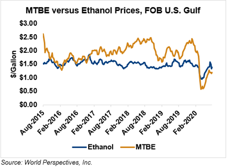 MTBE prices fell 2.5 percent last week but have erased those losses in early week trading, up 2.6 percent from Friday’s close through Tuesday’s trading. MTBE’s premium to FOB Houston ethanol has decreased from last week’s report and stands at -5.09 cents/liter (-19.29 cents/gallon).