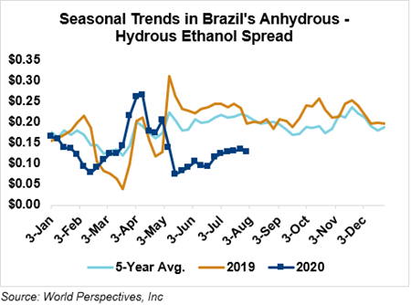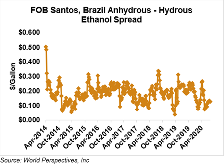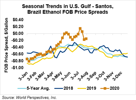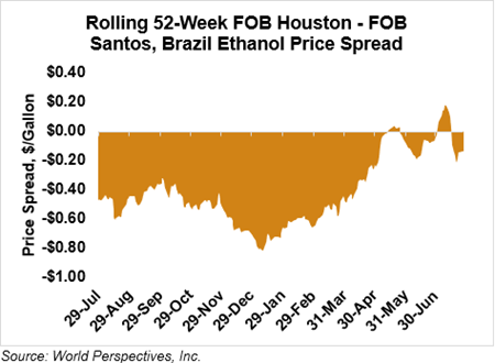 The FOB Gulf-Santos, Brazil ethanol spread has narrowed from last week’s close through Tuesday’s trading and is currently at -3.61 cents/liter (-13.66 cents/gallon).