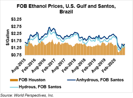 FOB Houston ethanol prices finished last week 11.5 percent lower but are  up 4.1 percent through Tuesday’s trading from Friday’s close. FOB Houston ethanol prices are quoted at 36.51 cents/liter (138.19 cents/gallon). FOB Santos, Brazil anhydrous ethanol prices were higher last week; they are up in early week trading, rising 1.3 percent to 40.11 cents/liter (151.85 cents/gallon) through Tuesday’s trading.