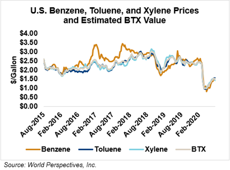 BTX component prices were mixed last week and are continuing that trend through Tuesday’s market close: Benzene is up 2 percent while Toluene is up 0.5 percent, and Xylene is down 2.2 percent. The estimated weighted average aromatic price is currently 39 cents/liter (147.63 cents/gallon), down from last Friday’s close. The BTX-Houston ethanol spread narrowed last week, and the weighted average BTX price is 2.49 cents/liter (9.44 cents/gallon) higher than the FOB Houston ethanol price.