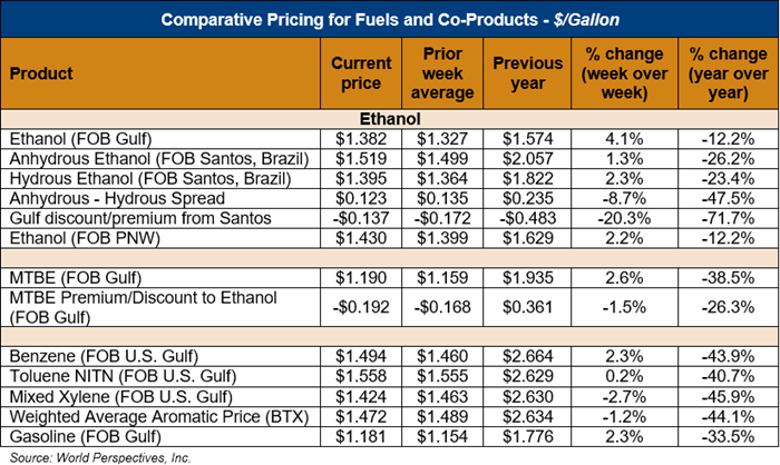 Market Outlook: U.S. ethanol prices ended last week 3.9 percent higher and are continuing that trend in early week trading, up 4.3 percent through Tuesday’s close. Midwest wholesale rack ethanol prices were lower to end last week and are down 0.5 percent through Tuesday’s market close to their last quote of 38.95 cents/liter (147.45 cents/gallon).